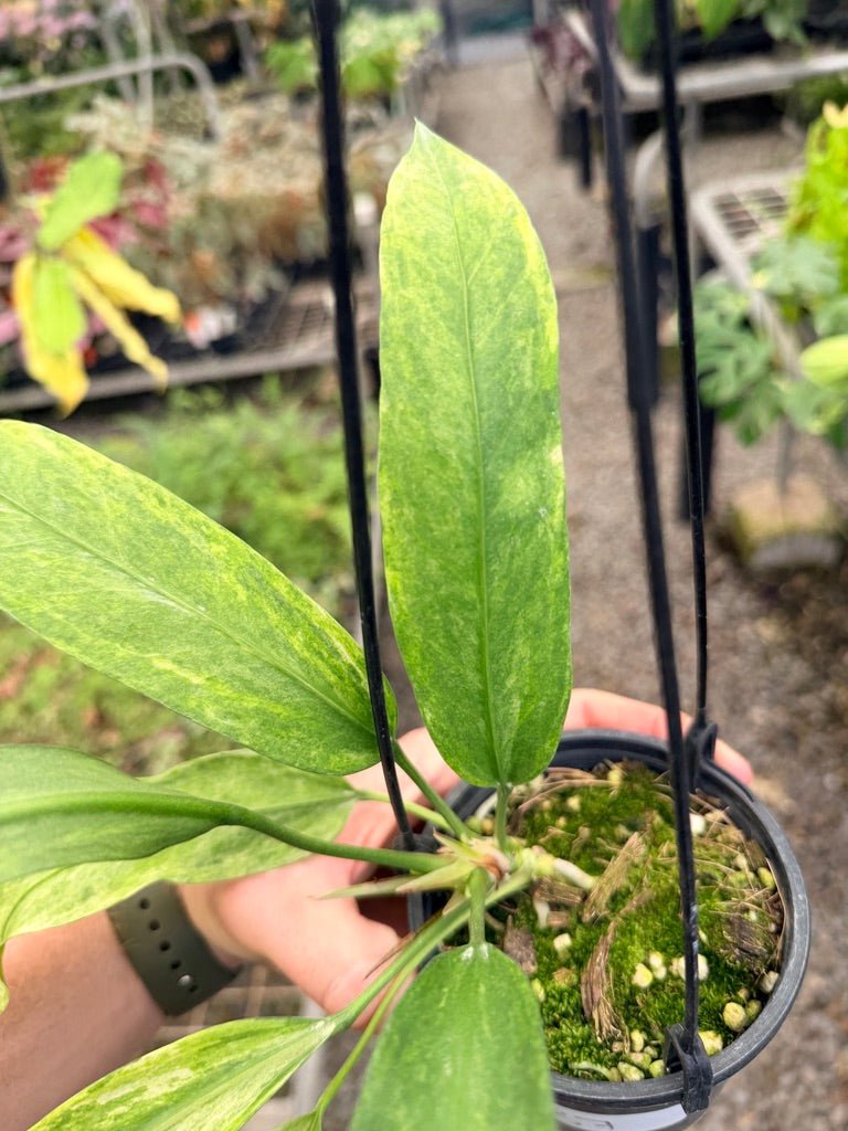 Anthurium vittarifolium Variegated is a stunning collector’s species prized for its long, pendulous leaves streaked with creamy variegation. This elegant strap-leaf Anthurium combines graceful form with rare colour patterning, making it a true showpiece for any serious aroid collection.