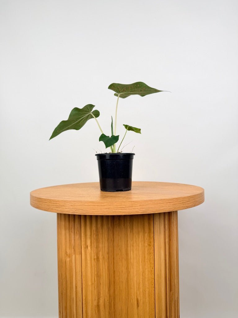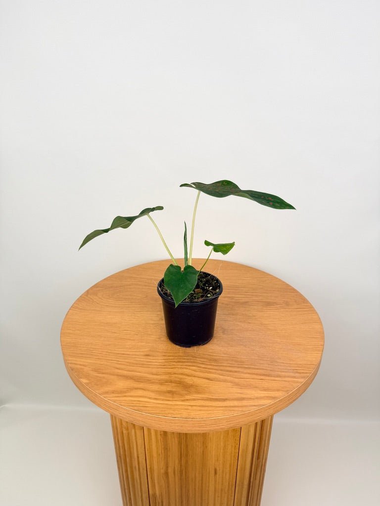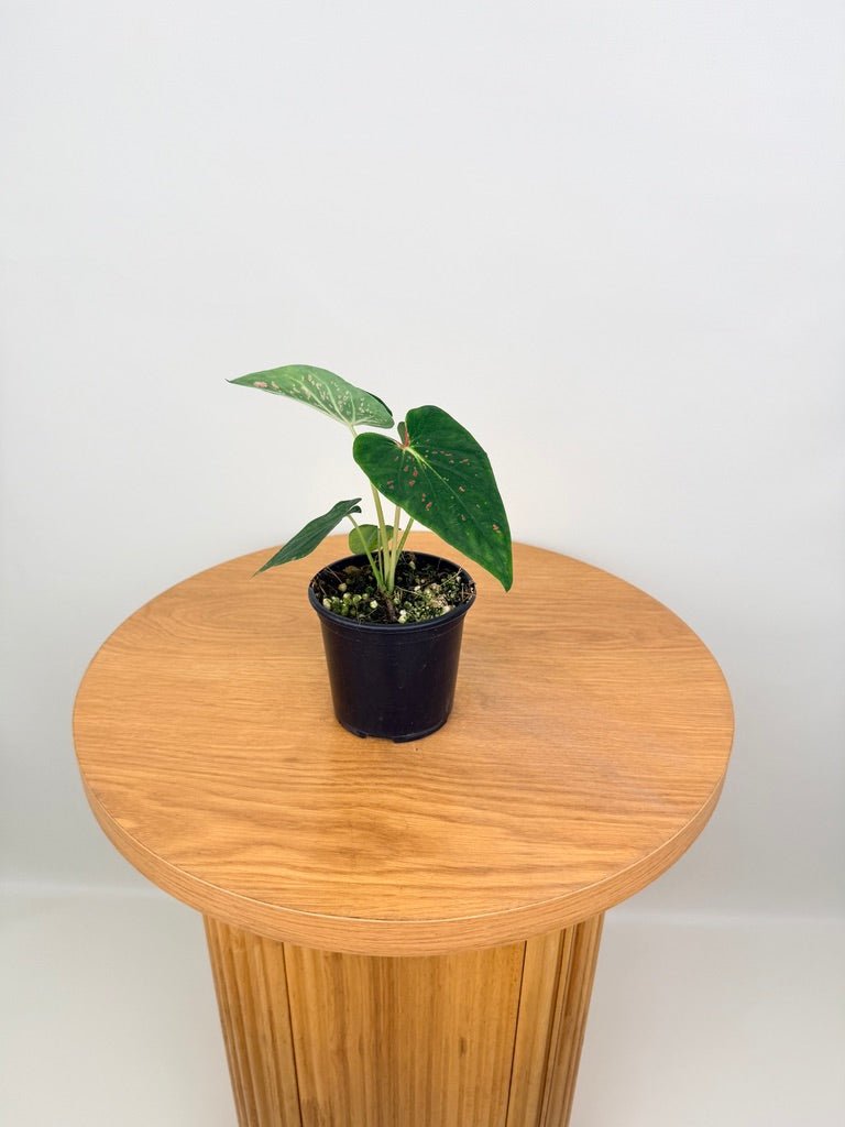 Caladium bicolor ‘Thousand Stars’ is a dazzling variety known for its speckled, star-like patterning across each leaf. Splashes of red scatter over lush green foliage, creating a sparkling, celestial effect that brings brightness and interest to any indoor display or shaded garden corner.