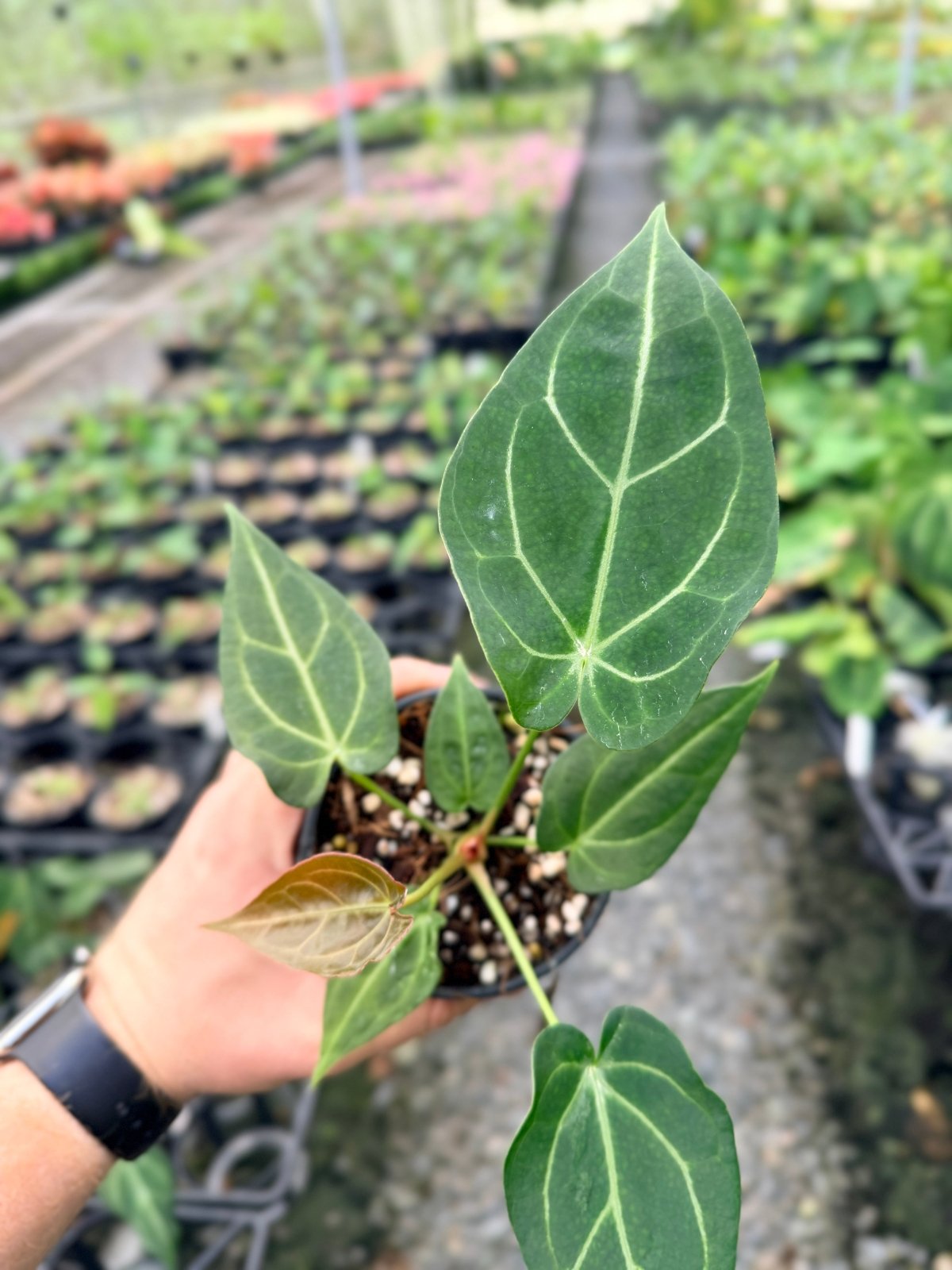 Anthurium magnificum × forgetii is a highly desirable velvet-leaf hybrid prized for its bold foliage presence and refined collector appeal, making it a standout addition to any serious indoor plant collection.