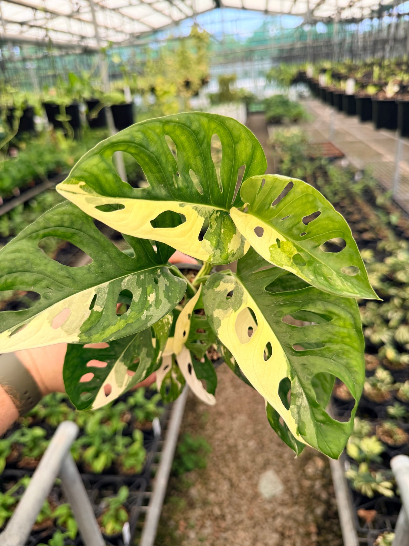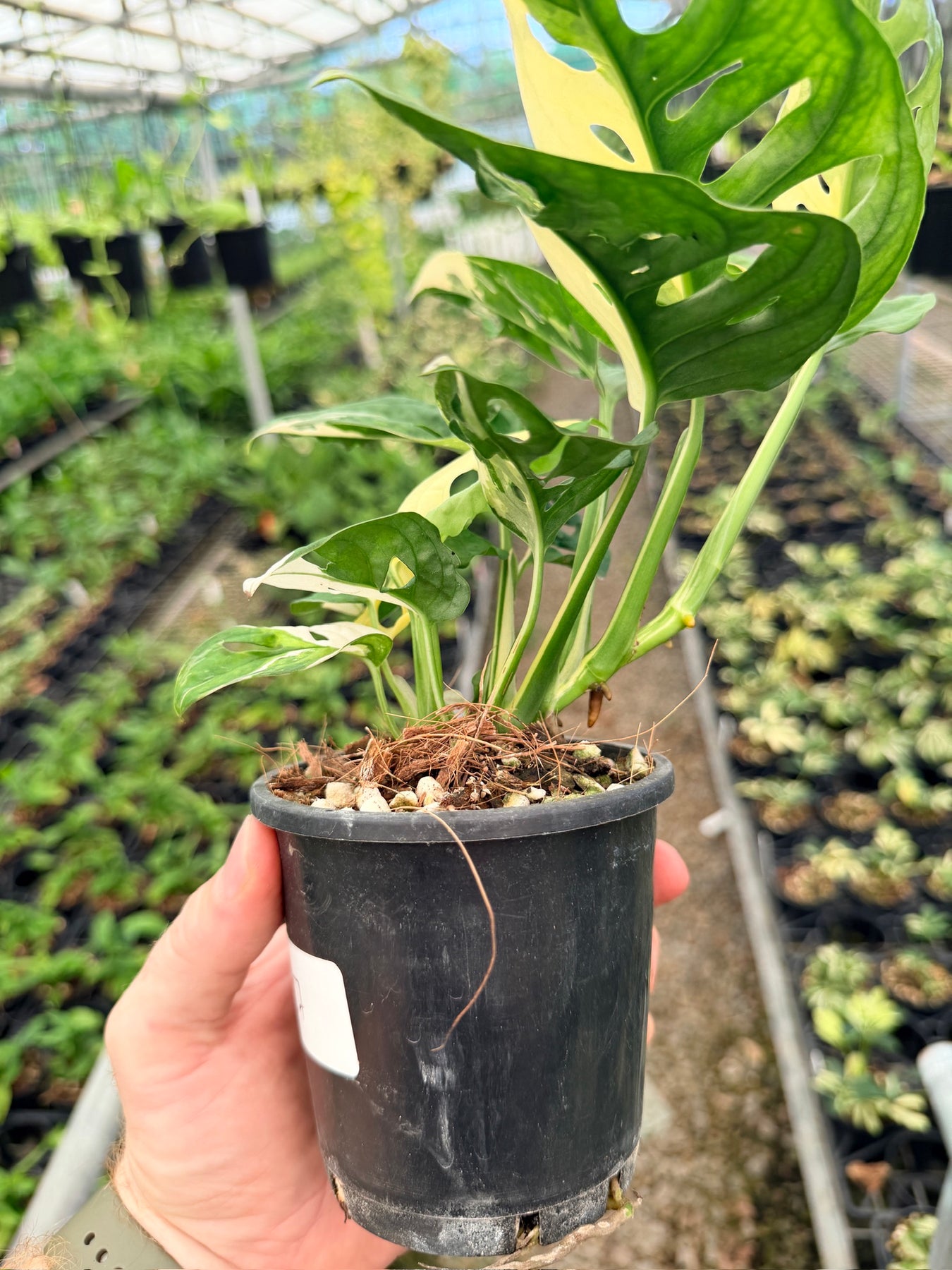 ✔️ Bold variegation in shades of white and green across each fenestrated leaf